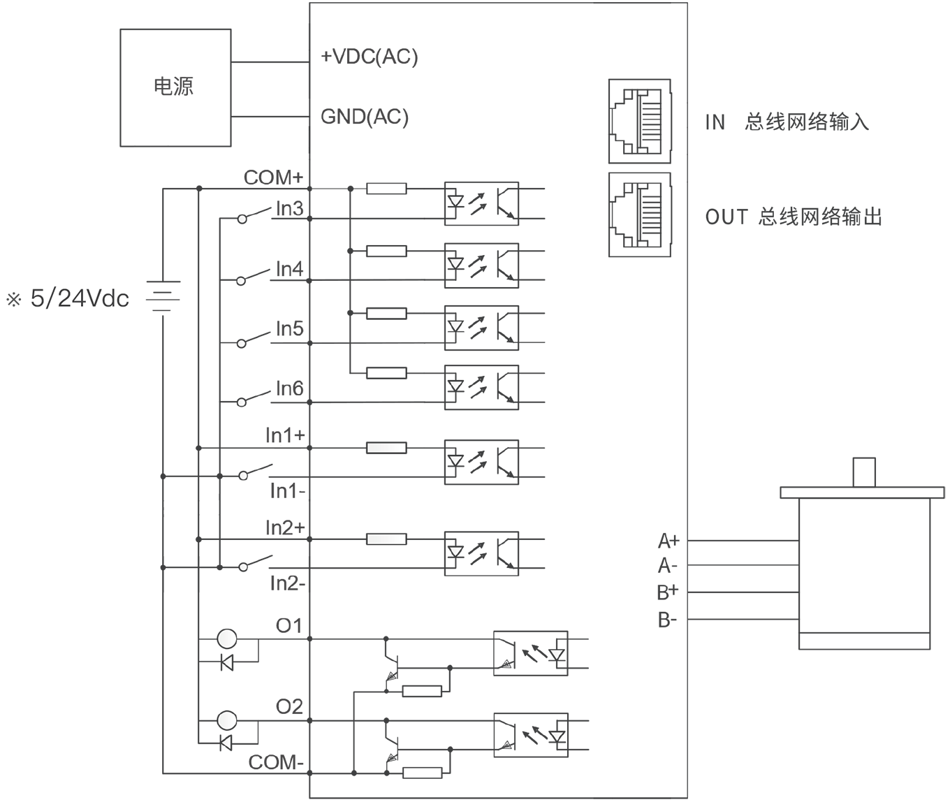 6路光電隔離的數(shù)字信號(hào)輸入:IN1、IN2為5V差分輸入,亦可接成5V單端輸入;IN3~I(xiàn)N6 為24V 單端輸入,共陽(yáng)極接法;